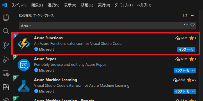 VSCode拡張機能として「Azure Functions」と「Azurite」のインストール