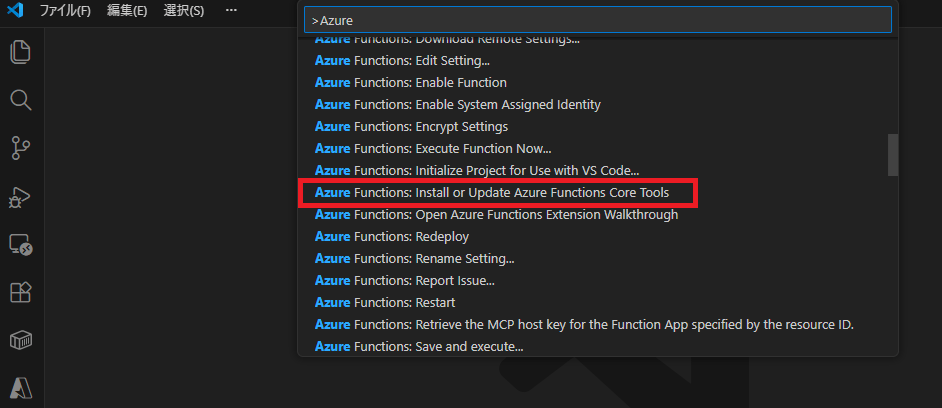 そこで「Azure」と入力して、「Azure Functions: Install or Update Azure Functions Core Tools」を実行します。