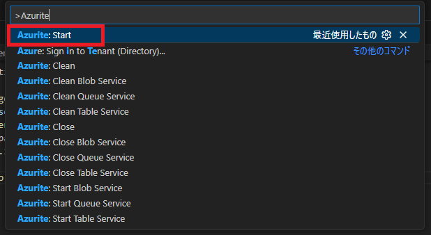 VSCode上で「Ctrl + Shift + p」でコマンドパレットを起動して、「Azurite: Start」を実行しましょう。