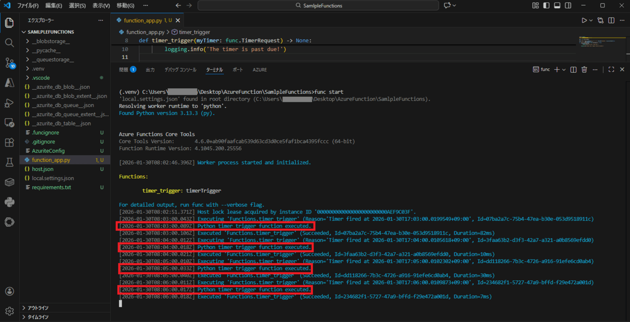 これでローカル環境上では正常にAzure FunctionがTimer Triggerで実行されることがわかりましたので、
