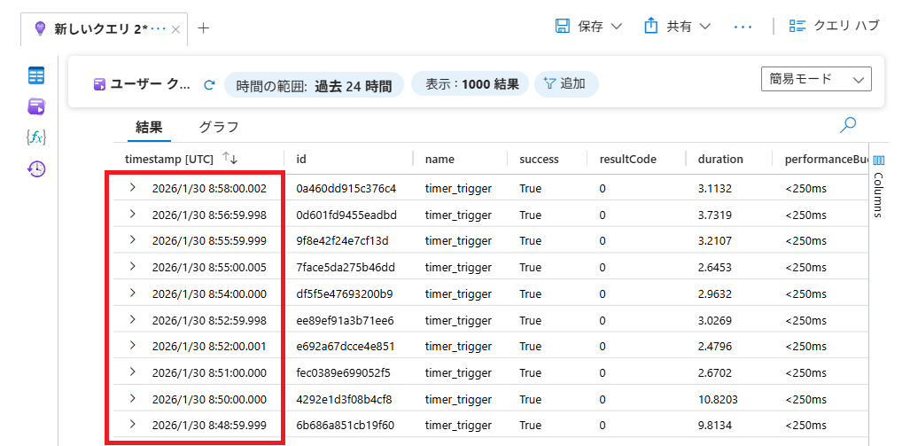作成されたAzure Functionsで「監視 > ログ」で「requests」テーブルを参照してみましょう。