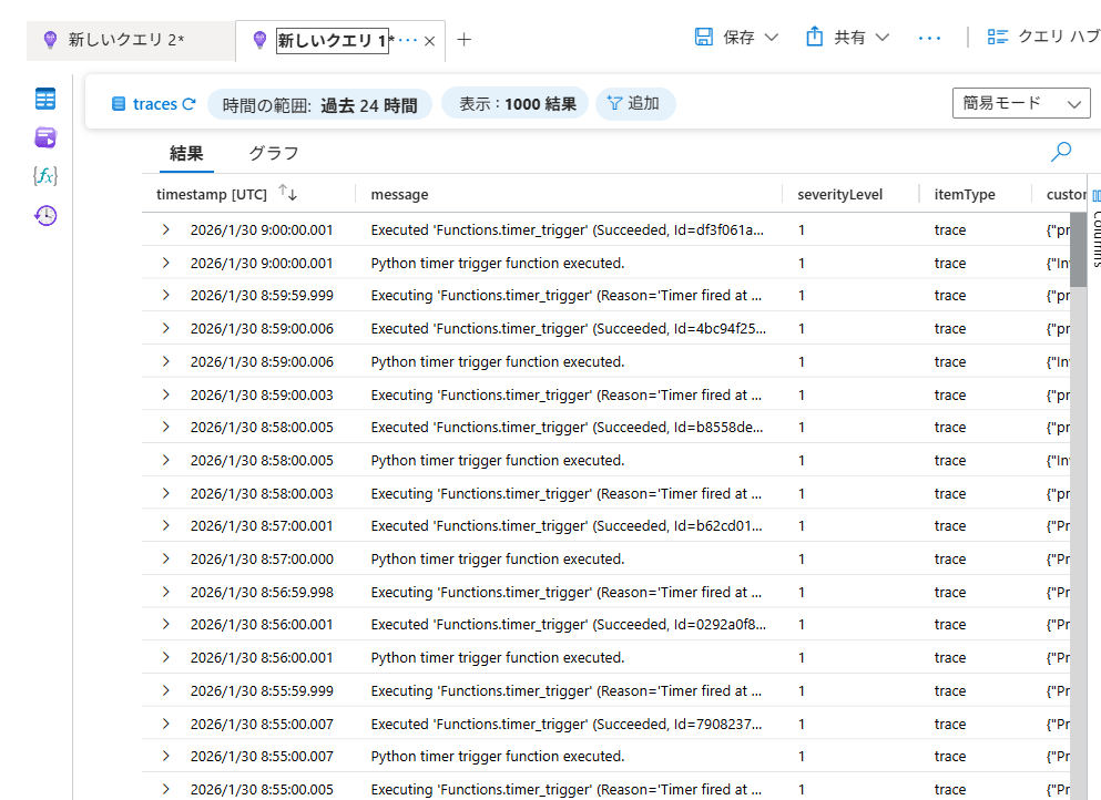 無事に「Python timer trigger function executed.」が1分おきに実行されていることがわかりますね。