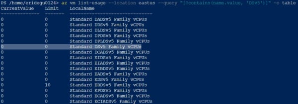 az vm list-usage コマンドでも確認したところ、DSv5 ファミリの vCPU クォータは CurrentValue / Limit ともに 0 であることが分かりました(下図)。