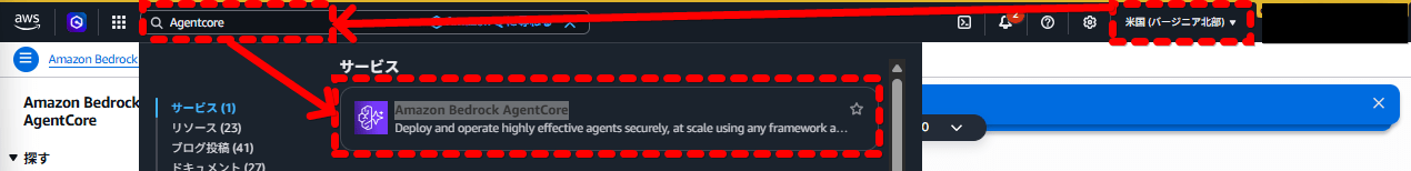 検索バーで「Agentcore」と入力し、Amazon Bedrock AgentCore のコンソールを開きます。