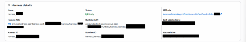 「Quick create harness」で自動作成されたAmazonBedrockAgentCoreHarnessDefaultServiceRole-xxxxxは、Harness削除後も残る場合があります。不要であればIAMコンソールから手動で削除してください。