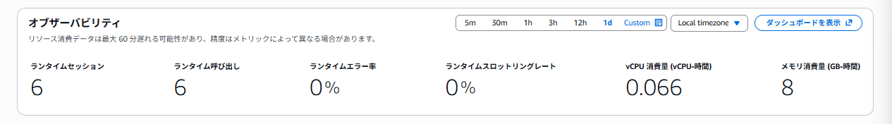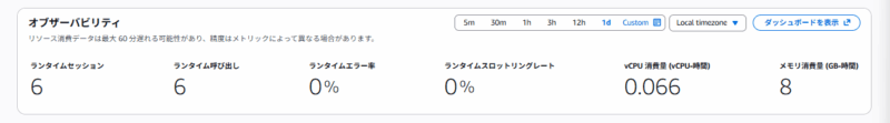 トレース・ログ・メトリクスが自動収集されます。ランタイムセッション数、ランタイムエラー率、vCPU消費量、メモリ消費量などのメトリクスが表示されます。
