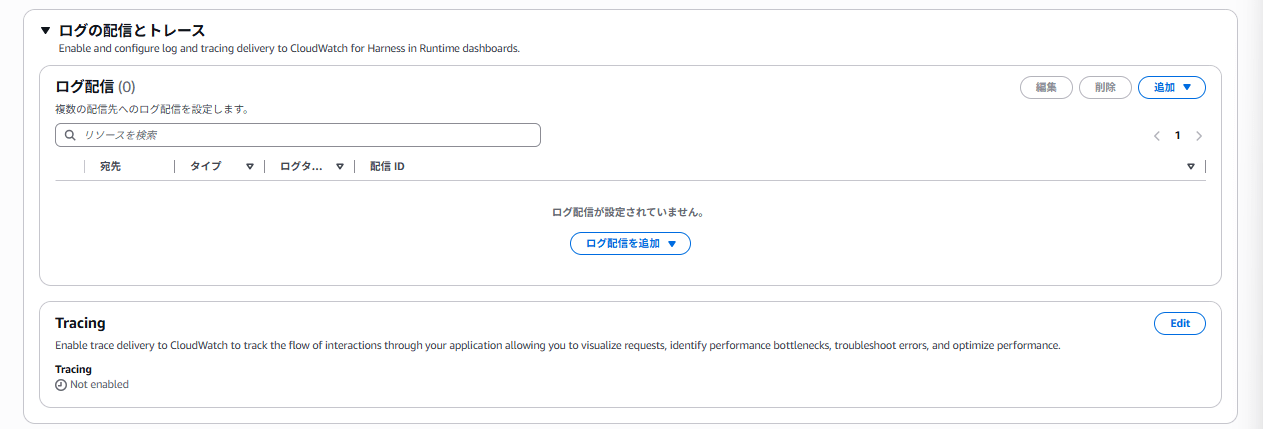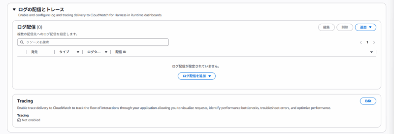 Observability メトリクス表示、ログ配信、トレースの設定(確認画面のみ)