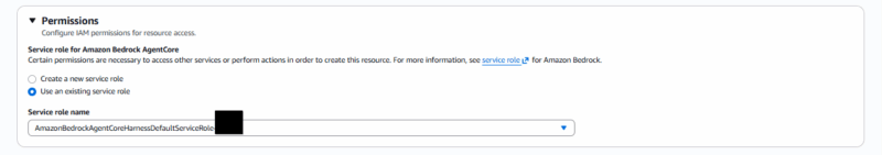 「Quick create harness」で作成した場合はAmazonBedrockAgentCoreHarnessDefaultServiceRole-xxxxxが自動選択されています。
