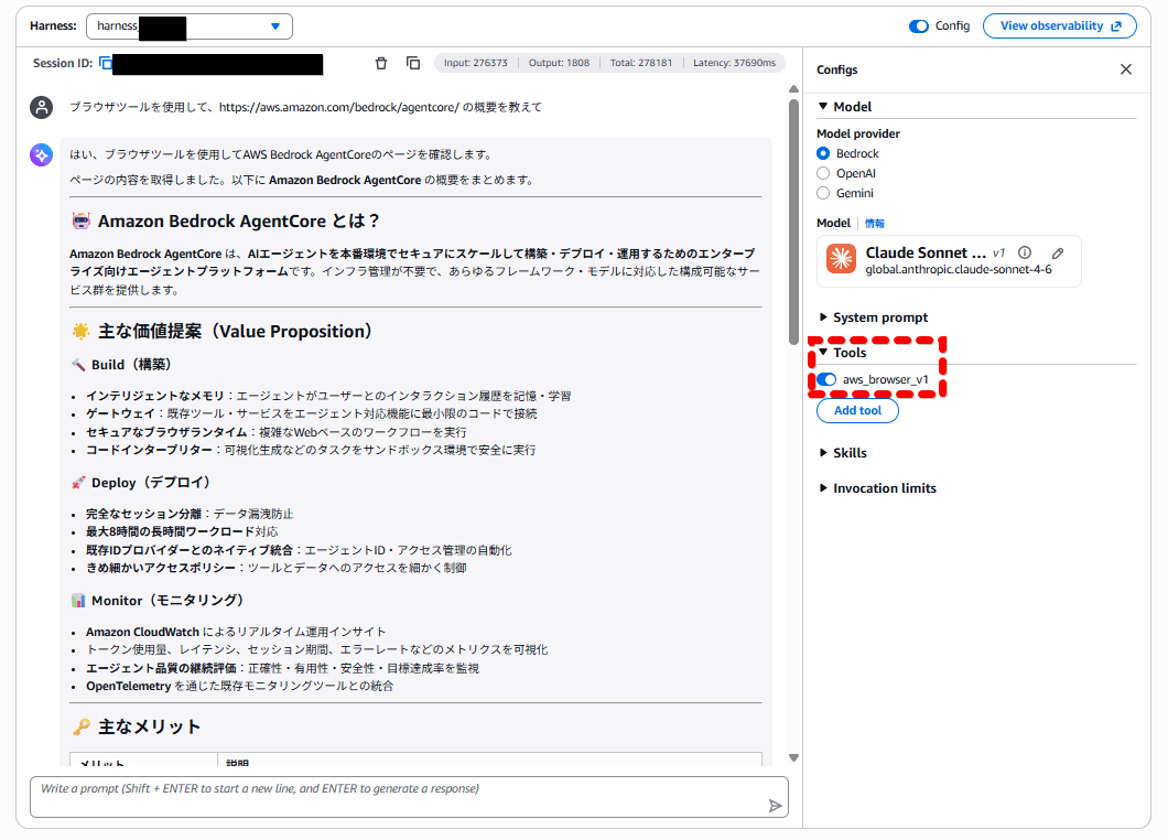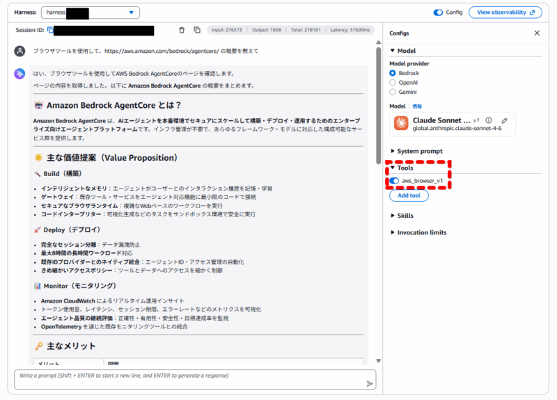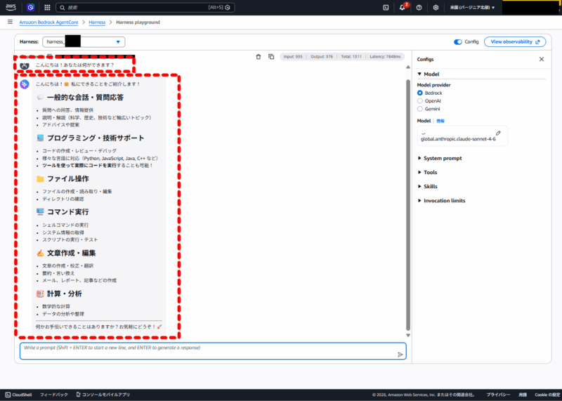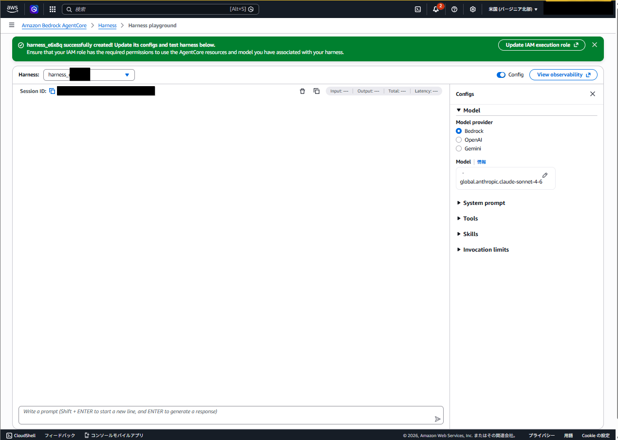 2026年4月22日にプレビューリリースされたAmazon Bedrock AgentCore Managed Harness (以下、AgentCore Harness)を、AWSマネジメントコンソールで触ってみました。