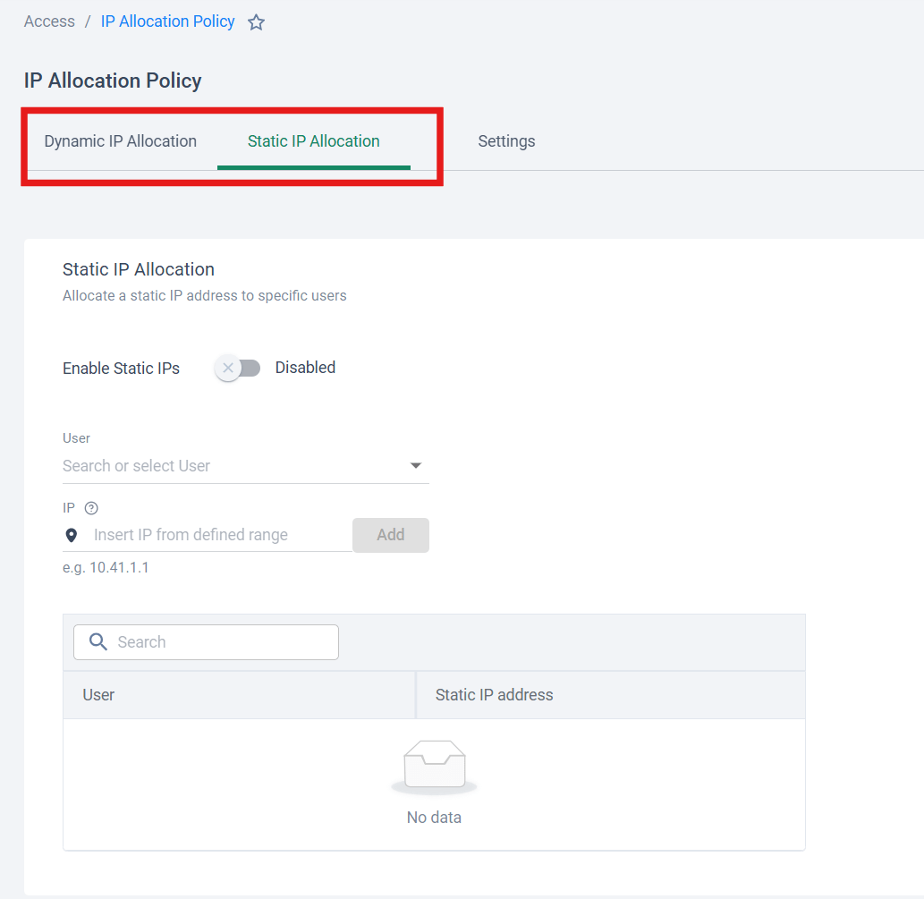モバイルユーザ向けのIPレンジは、[Access] > [IP Allocation Policy]から設定します。