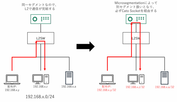 Microsegmentationを有効にすると、DHCPにより配布されたIPを使用する機器は、内部的には/32のセグメントに分割されているため、別の機器と通信する場合には必ずCato Socket、つまりLAN FirewallまたはWAN Firewallを経由することになります。これによって、確実にセキュリティチェックを行うことが可能となるのです。