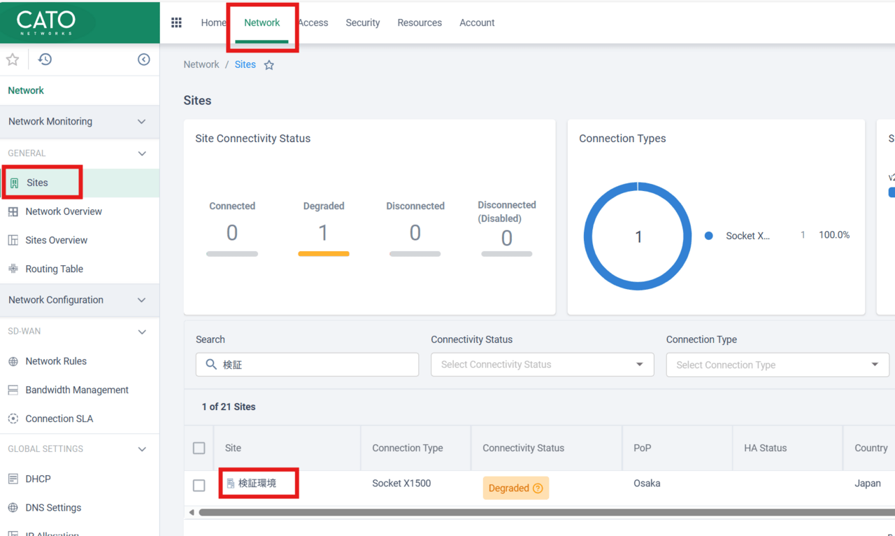 CMAにログインし、[Network] > [Site]から設定を行いたいSiteを選択します。