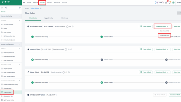 [Access] → [Client Rollout] → Windows Clientの[Download Client] → [Download MSI]
