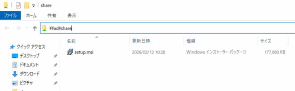 ダウンロードしたMSIインストーラーファイルを、Windows PCから接続可能な共有フォルダーへ配置してください。