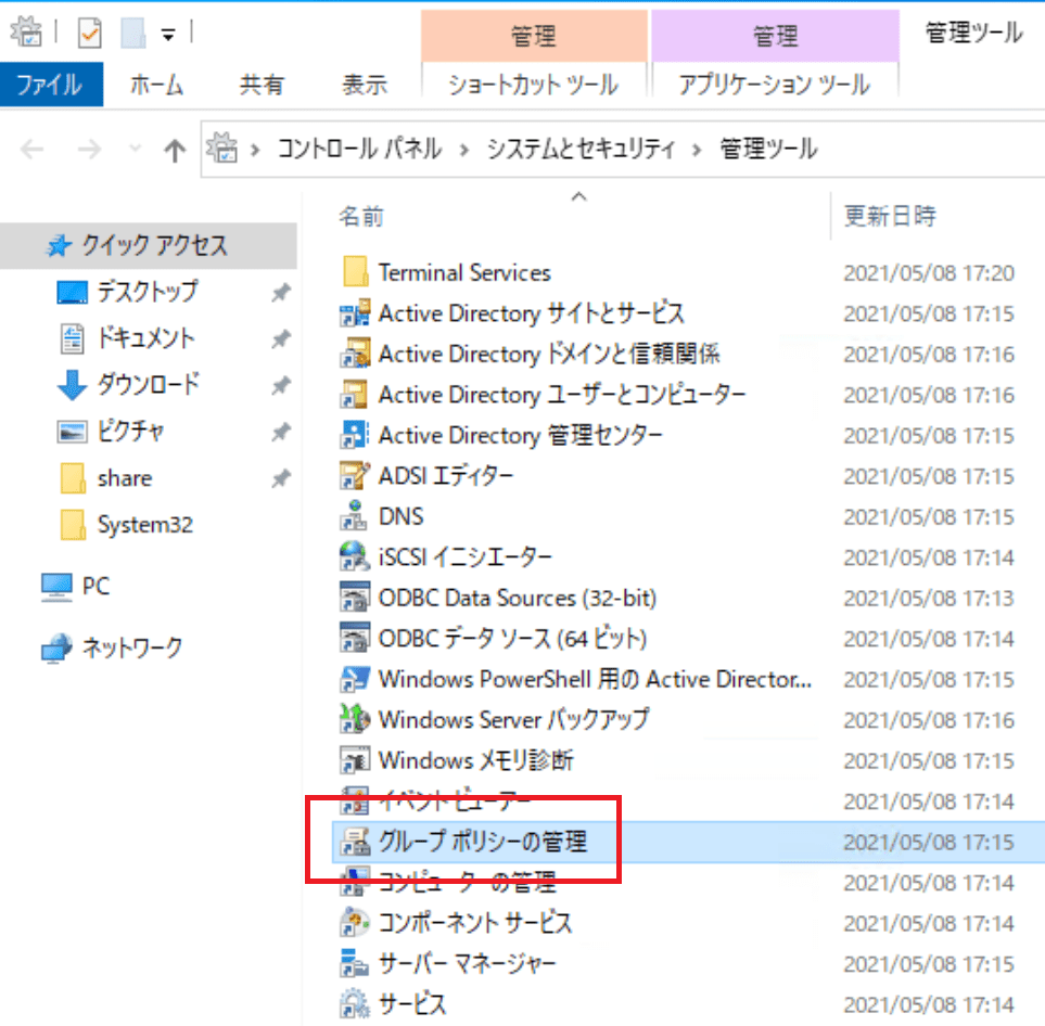 ドメインコントローラーにサインインし、管理ツールから[グループポリシーの管理]を起動します。