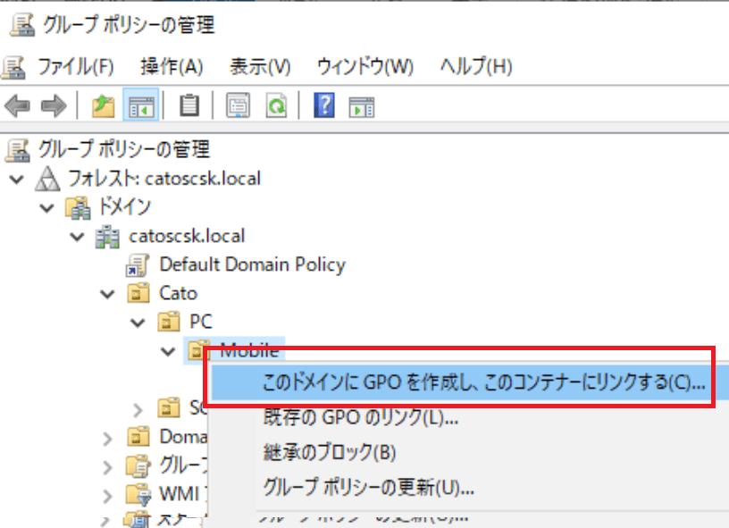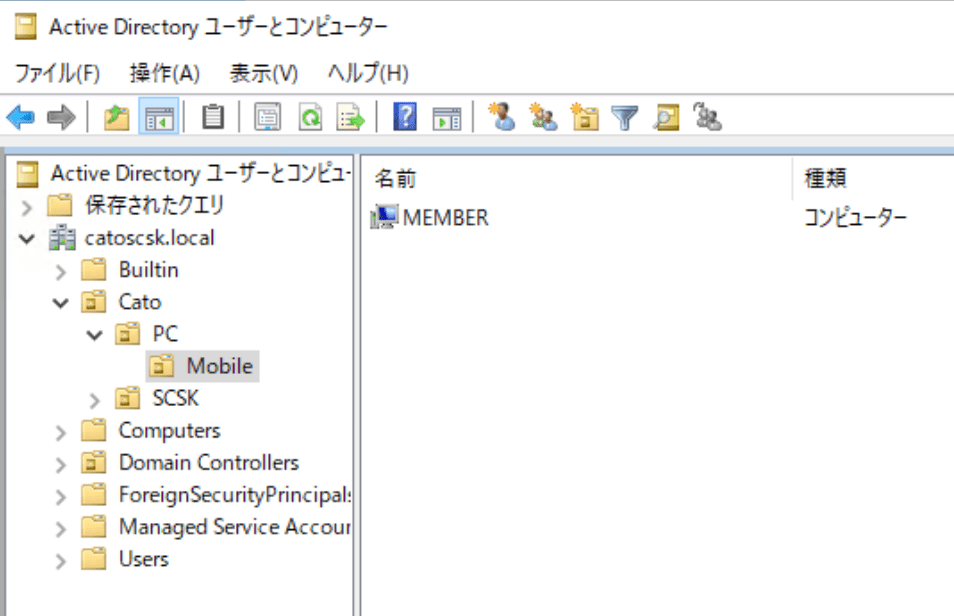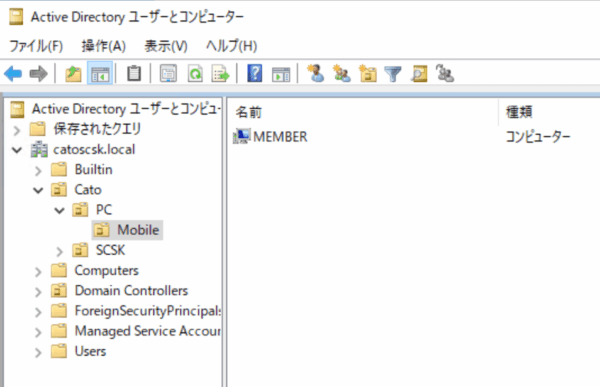 ここではMEMBERコンピューターオブジェクトが所属している[catoscsk.local/Cato/PC/Mobile/]OUを対象とします。