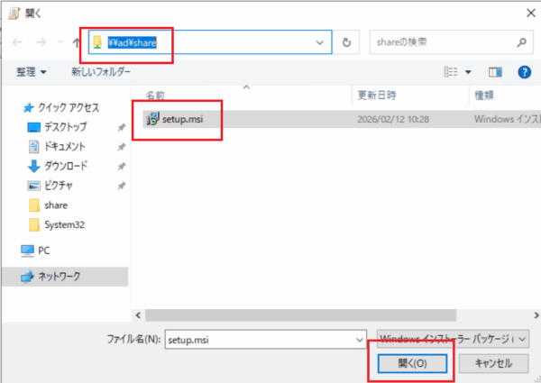 [開く]ダイアログボックスが表示されるので、パスの箇所に共有フォルダーのUNCパス(例:\\ad\share\)を入力し、対象ファイル(例:setup.msi)を選択し[開く]をクリックしてください。