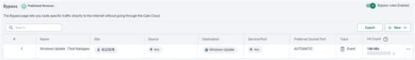 Windows Updateのほか、既定のバックアップデータ保管先としてのクラウドサービスや、ゲストWi-Fiを拠点内で提供している場合に送信元指定して、Catoを経由させないといったこともBypassの利用シーンとして想定されています。