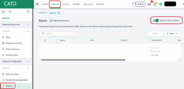 まず前提として、Catoではすべてのトラフィックを Cato Cloudに集約しセキュリティチェックすることが推奨されています。Bypass機能を利用するとセキュリティチェックが行われませんので、この点はご承知おきください。