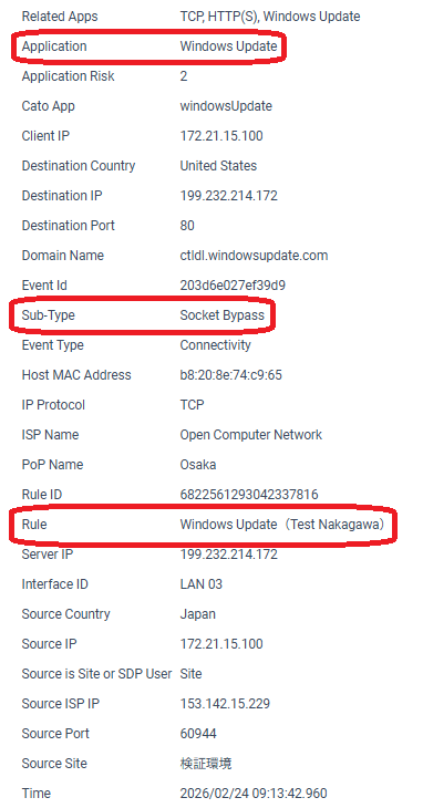 特にCatoのアップデート情報では言及されていませんが、従来のBypass機能ではイベントログは残せなかったところ、今回のアップデートでイベントログに記録されるようになりました。