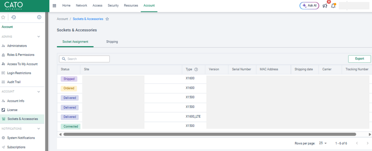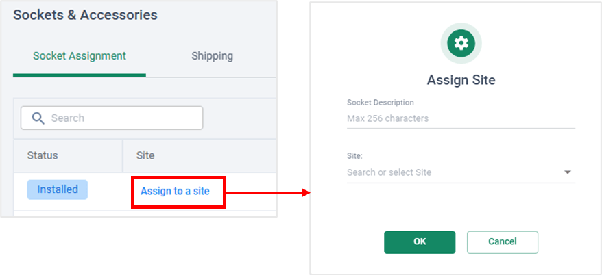 利用する拠点へのSocket配送が開始されたら、CMAの[Account] > [Sockets & Accessories]にて、当該のSocketを利用予定のSiteへ割り振ります。これはCMA上での作業なので、インターネットにさえ繋がっていればどこからでも実施可能です。