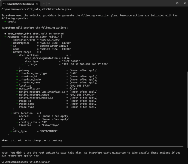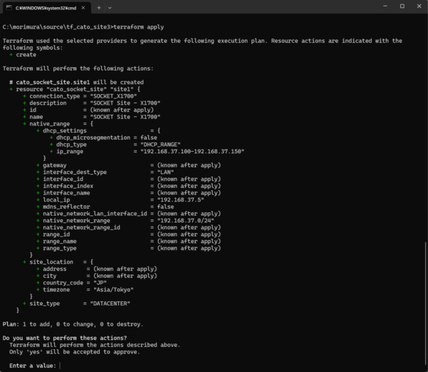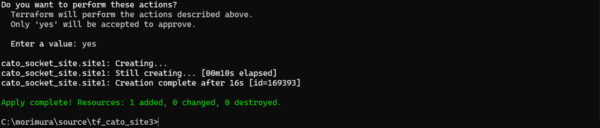 実行計画の確認ができ、ApplyするとCatoクラウドにサイトが構築されます。