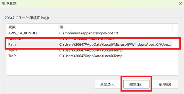 ここではユーザー環境変数に設定します。システム環境変数でもかまいません。[Path]を選択し[編集]ボタンをクリックしてください。