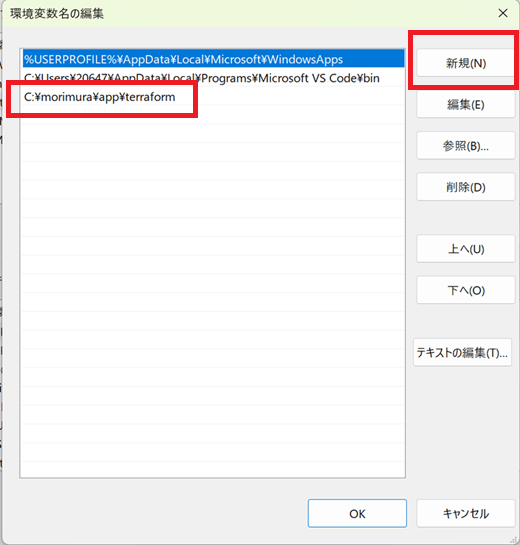 [新規]ボタンをクリックし、[terraform.exe]を保存したパスを入力し[OK]ボタンをクリックしてください。開いていた元のウィンドウも[OK]ボタンをクリックし閉じてください。