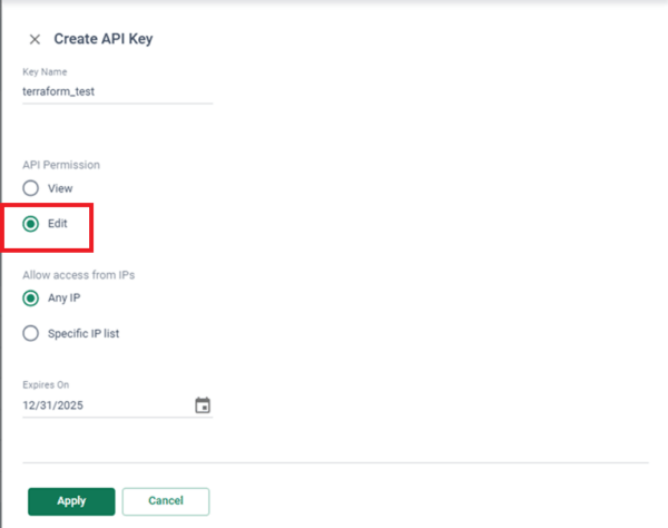 API Permissionは[Edit]、その他の項目は適宜入力し、[Apply]ボタンをクリックしてください。