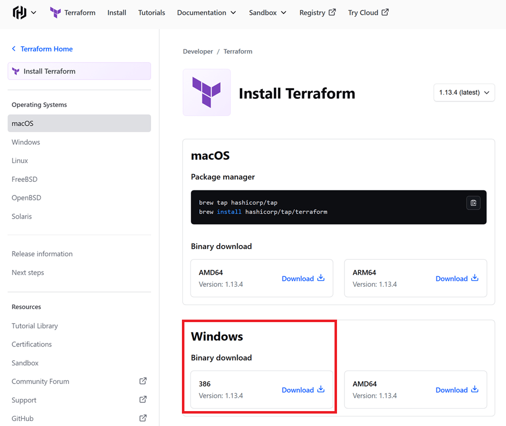 Terraformの公式サイトにアクセスしてください。ここでは[Windows]-[Binary download]-[386]-[Download]と選択してください。