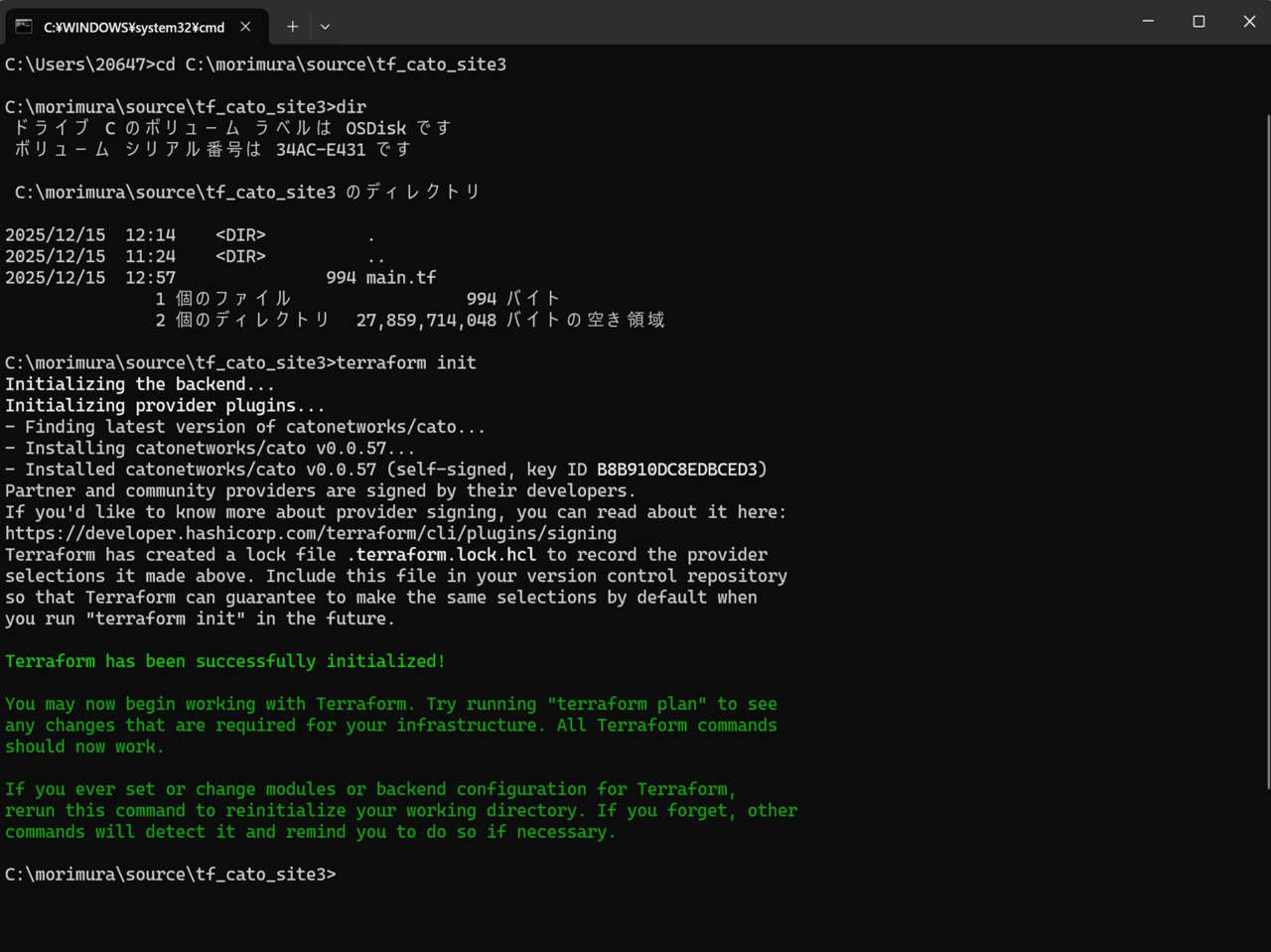 コマンドプロンプト上で先ほど作成したmain.tfのフォルダに移動してください。