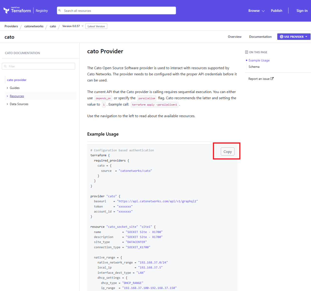 公式ドキュメント(https://registry.terraform.io/providers/catonetworks/cato/latest/docs )のサンプルコードで[Copy]ボタンをクリックした後、作成したmain.tfに貼り付けてください。