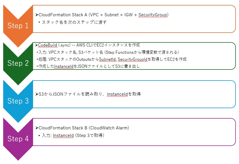 CloudFormation Stack A 作成完了 ↓ ExtractVpcOutputs (Passステート) でスタック名等を整形 ↓ CodeBuild 環境変数 (VPC_STACK_NAME, S3_BUCKET) を受け取り ↓ buildspec.yml内でVPCスタックのOutputsを問い合わせてSubnetId, SecurityGroupIdを取得 ↓ EC2インスタンスを作成 ↓ result.json を S3 に書き出し ↓ S3 GetObject + States.StringToJson で InstanceId を取得 ↓ CloudFormation Stack B Parameters (InstanceId)