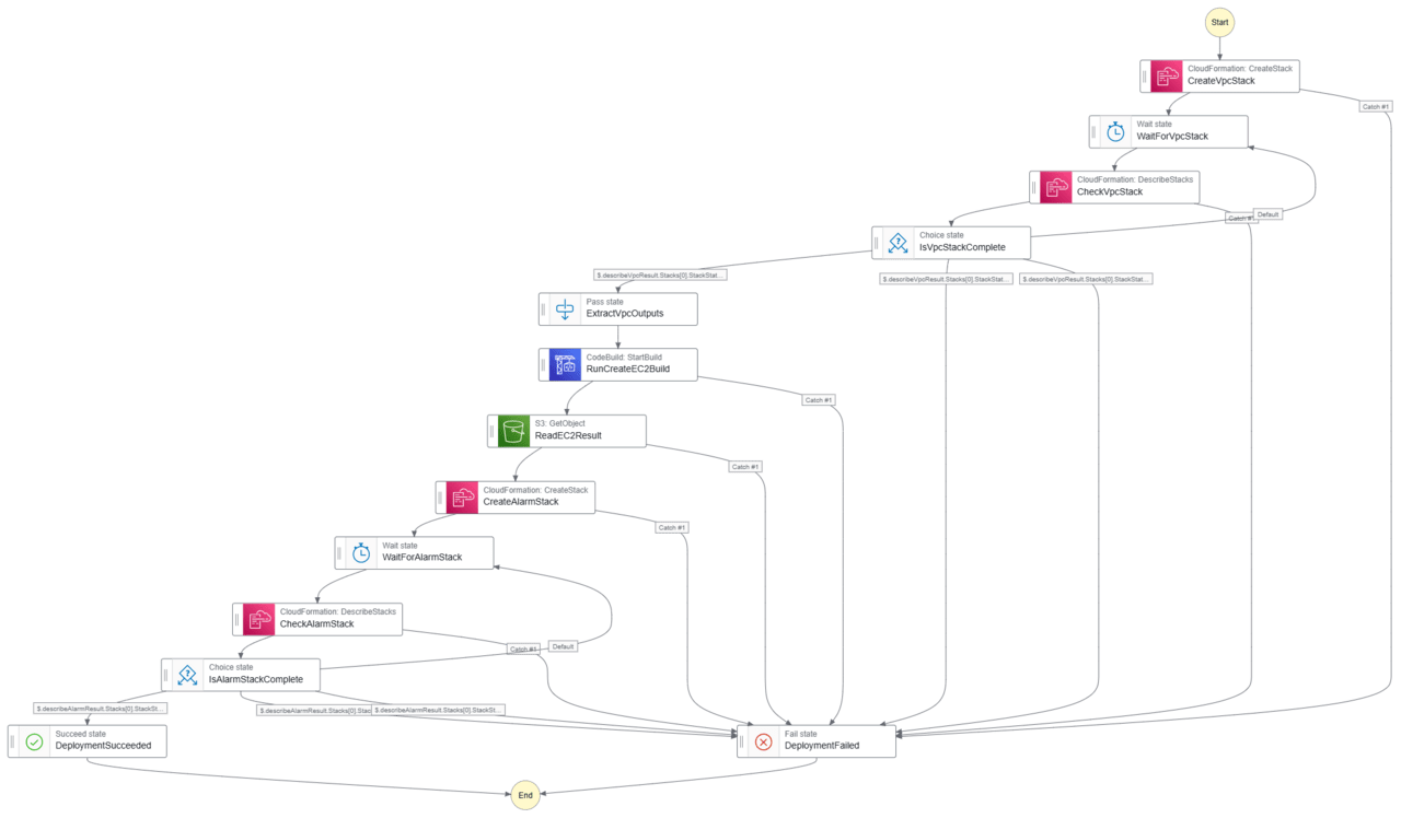 上記それぞれを個別に考えると、CloudFormationのスタックをデプロイするAWS CLIコマンドと個別のAWSリソースをデプロイするAWS CLIコマンドを羅列すればよくない?とか、シェル変数に入れて受け渡すだけでしょう?とか、待っている数十分の間にシェルスクリプトの実行環境が障害起こす可能性がどれだけあるというの?となりますが、こうした細かい考慮事項を自分で管理しようと考えると意外に面倒なものです。Step Functionsを使えば各ステップの実行状態がコンソールで視覚的に確認できるため、どこで何が起きたかが一目瞭然ですし、問題が起きた場合のエラーハンドリングも簡単に実装できます。