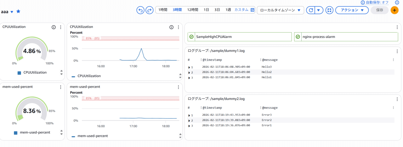 例として、CPU使用率(標準メトリクス)、メモリ使用率(カスタムメトリクス)、サンプルのアラームステータス、および転送ログを一覧表示しています。参照する対象がほぼ固定の場合は一つ作っておけば大変便利です。これを普通にそれぞれ確認するとなると、複数画面を横断する必要があります。