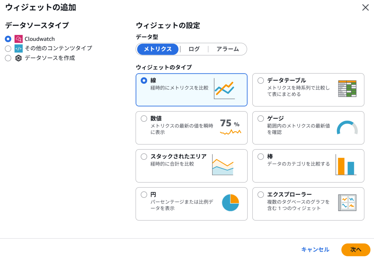 データ型はメトリクス、ログ、アラームと3種類あり、メトリクスは例で挙げた画像の左半分、ログは右下部分、アラームは右上部分に対応しています。