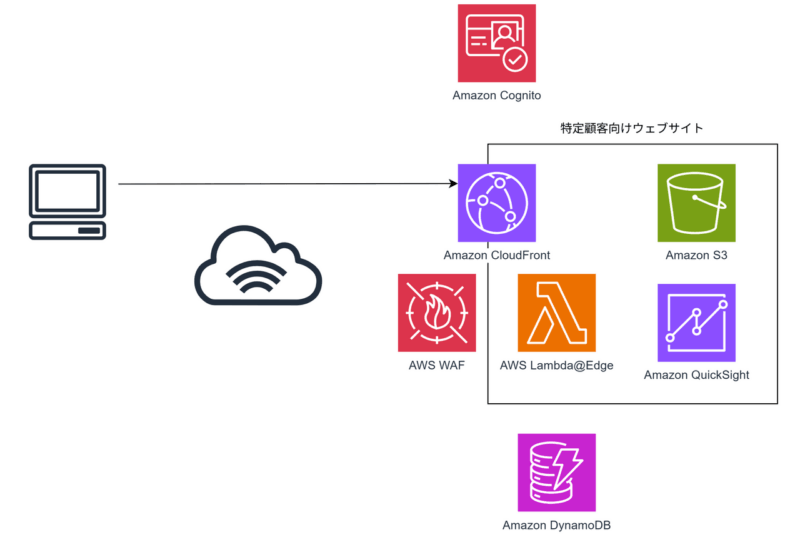 特定顧客向けのウェブサイトです。サイトの内容はQuickSightのURL埋め込み機能を使用してQuickSightダッシュボードを表示するだけのシンプルなものです。取得するダッシュボードのIDなどを取得するためにDynamoDBを、サイトアクセスの認証のためにCognitoユーザプールを使用しました。アーキテクチャ図は以下の通りです。