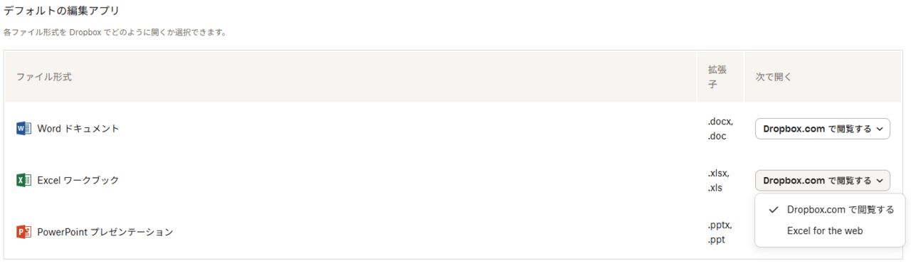 デフォルト設定の変更: 毎回「[Word/Excel/PowerPoint] for the web」を選択するのが面倒な場合は、dropbox.com でアバター(プロフィール写真またはイニシャル)をクリック、[設定] > [アプリ] > [デフォルトの編集アプリ] から、Office ファイルを常に [ [アプリ名] for the web ] で開くように設定できます。