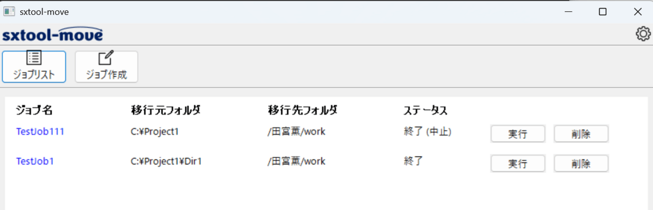 「セルフデータ移行ツール」の実行結果(ジョブリスト)画面例
