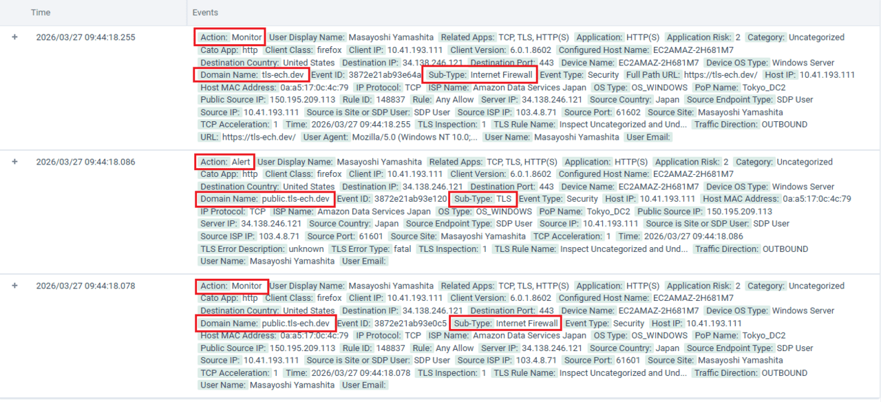 上記のテストサイトの場合ですと、ダミーのドメイン名は “public.tls-ech.dev” で、イベントには次のような記録が見つけられます。(TLS Inspection を有効にした環境での例で、本物のドメイン名のイベントも合わせて抽出しています。)