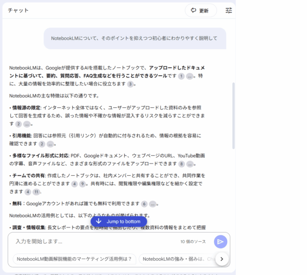 たとえば、複数の資料や膨大な情報が手元にある場合でも、「この会議の要点は?」「この資料全体のまとめを知りたい」といった形で質問を投げるだけで、NotebookLMが関連箇所を抽出し、わかりやすく整理して回答してくれます。