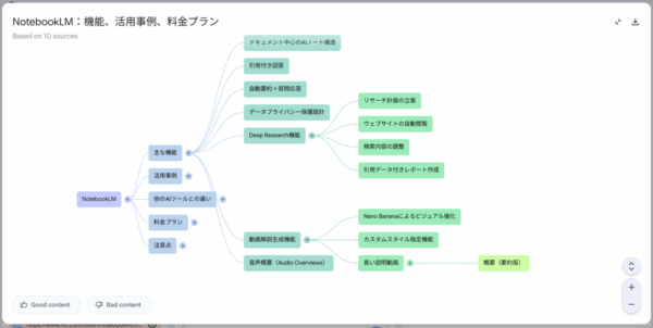 NotebookLMには、AIが自動でマインドマップを作成してくれる機能も搭載されています。マインドマップとは、中心となるテーマから関連する情報やキーワードを放射状に広げて視覚化することで、情報の構造や繋がりを直感的に把握できる思考整理ツールとして知られています。