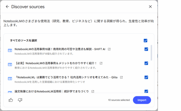 読み込ませるソースが決まっていないときは、右上の「Discover sources」から、調査したいことについて検索をかけると合致するソースを見つけて提示してくれます。