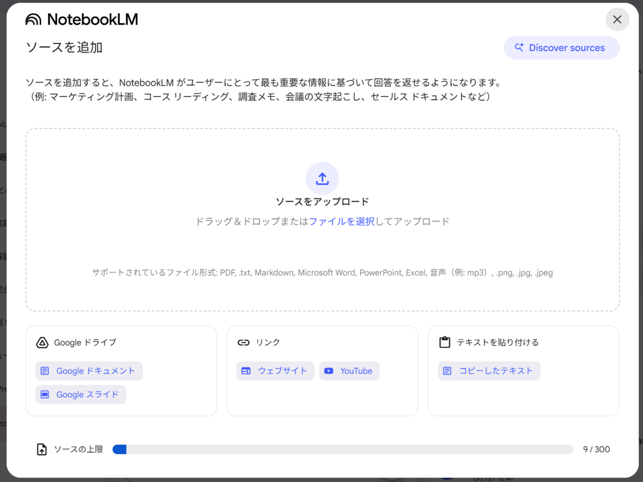 NotebookLMでは以下のファイルや情報源をソースとして指定できます。