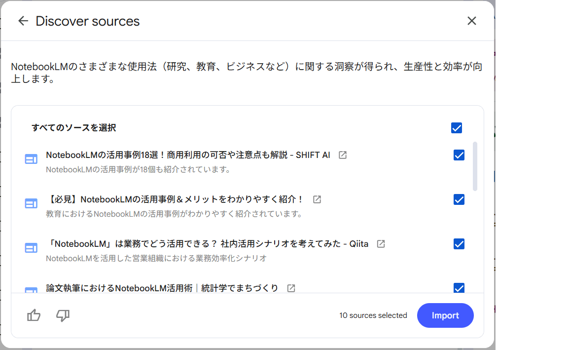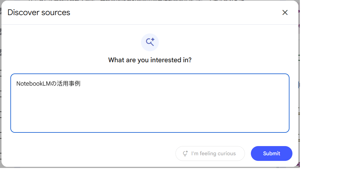 読み込ませるソースが決まっていないときは、右上の「Discover sources」から、調査したいことについて検索をかけると合致するソースを見つけて提示してくれます。