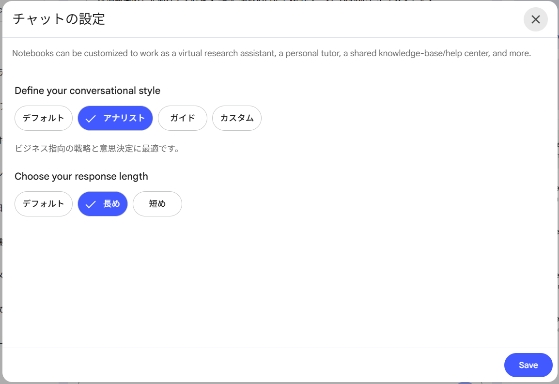 右上の「ノートブックを設定」から会話のスタイルをカスタマイズできます。デフォルトの会話スタイルから、より具体的なニーズに応じた設定への変更が可能です。