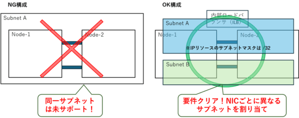 Azure上で仮想IP(VIP)を機能させるためには、ロードバランサー(ILB:内部ロードバランサー等)を用いたネットワーク切り替えが前提となります。この仕組みを正常に動作させるため、LifeKeeperの要件として「保護するNICごとに異なるサブネットを割り当てること」が必須(同一サブネットでの構成は未サポート)となっているのです。