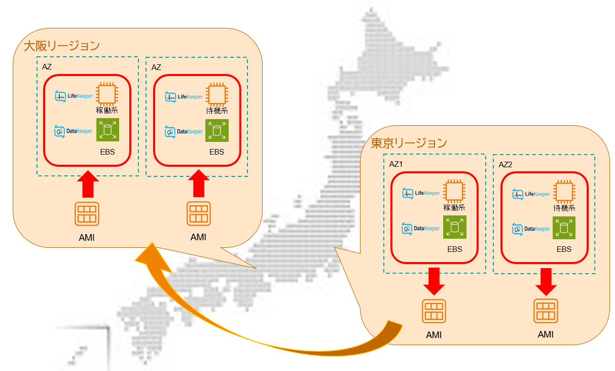 本番サイトである「東京リージョン」でAMIを取得し、DR発動時にそのAMIから「大阪リージョン」にサーバを作成するような使い方となります。