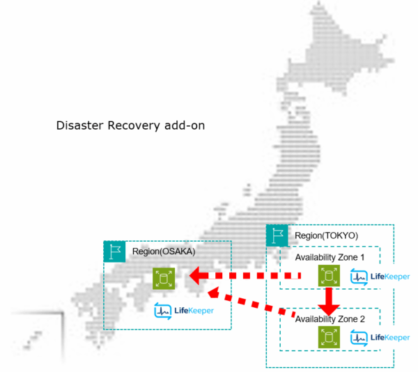 東京リージョン側でAZ跨ぎのHAクラスター(データはリアルタイム同期)を組み、大阪リージョンにもEC2インスタンスを立てて、Linbit社のデータレプリケーションソフトウェアであるDRBDを用いて非同期でデータを送る形になります。この構成では、3台のEC2インスタンスが常に起動しており、それぞれにLifeKeeperがインストールされています。