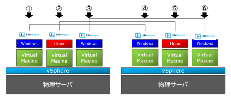 以下のイメージ図を見た時に、物理サーバ数でカウントする場合はLifeKeeperのライセンスは2つで良さそうですが、Virtual Macine数でカウントする場合は6つ必要になりそうです。